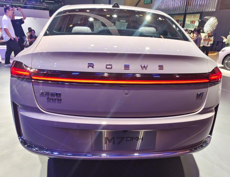 从车型侧面我们能够明显发现,该新车采用了长车头短车尾的运动化设计,尾部带有一点溜背效果。从配置层面来看,匹配了无钥匙进入系统以及19英寸的多辐式轮毂。车型尾部则是贯穿样式的尾灯,搭配上运动尾翼造型以及横向贯穿式的镀铬饰条,层次感还是挺鲜明的。车身数据部分,这款荣威M7 DMH的长宽高分别为4940/1890/1510mm,轴距是2820mm,这是一款典型的中级车水准,但是车长部分还是稍微有点越级的(说个题外话,如果是如此长度的纯电,轴距绝对可以达到2.9米,这就是油电混动或者燃油车的明显不足)。